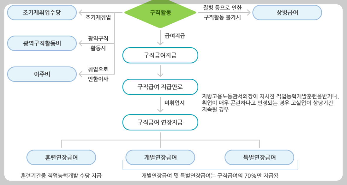• 실업급여는 구직급여와 취업촉진수당으로 구분되어 있습니다.