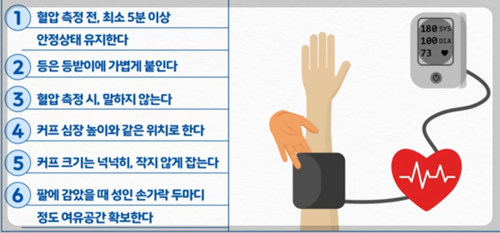 ⦁ 혈압 측정하기 전에 5분 이상 안정을 취하고 손가락이 들어갈 정도로 느슨하게 감고 측정을 한다.