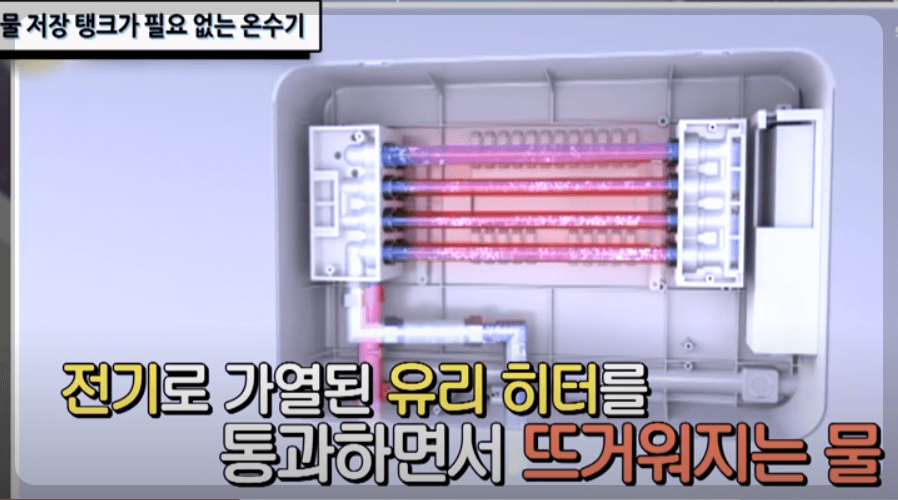 - 온수탱크를 이용하여 저 정하는 식이 아니라 석영유리관을 이용해서 물을 데우는 방식이다