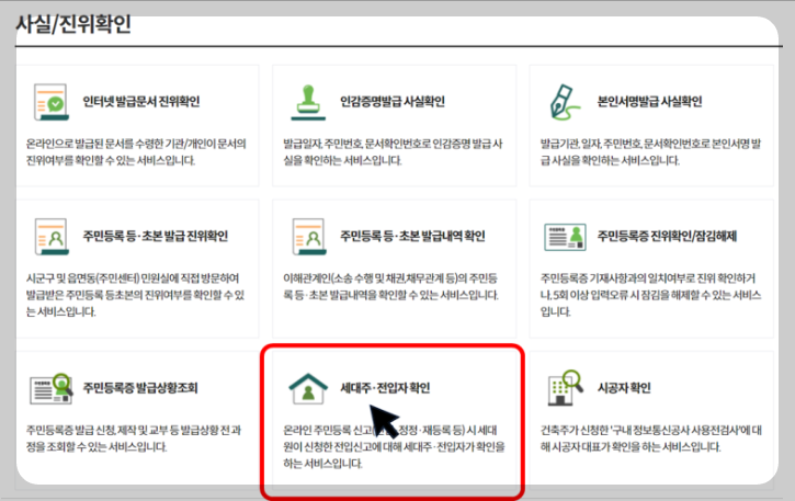 - 전입자는 정부 24에 사실/진위 확인 메뉴에서 확인 절차를 거쳐야 합니다.