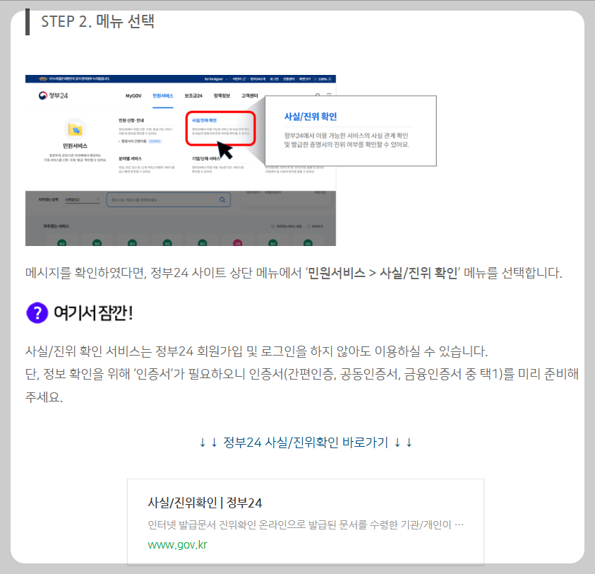 - 메시지를 확인하였다면, 정부 24 사이트 상단 메뉴에서 민원서비스> 사실/진위 확인