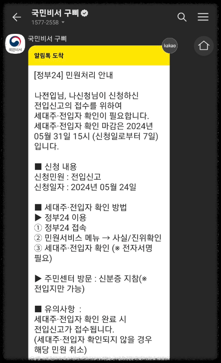 - 전입 사실 확인을 위해 전입자에 세 메시지가 전송됩니다.