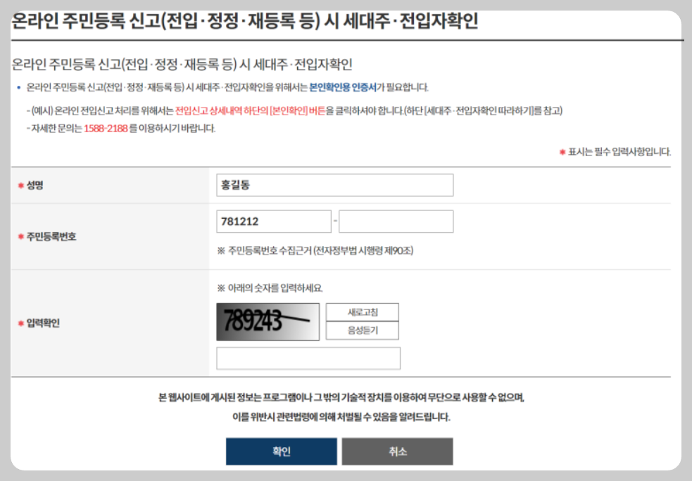 3. 세대주, 전입자 확인에서 신고내용을 확인하신 후, 확인을 클릭하여 본인 확인을 완료합니다.