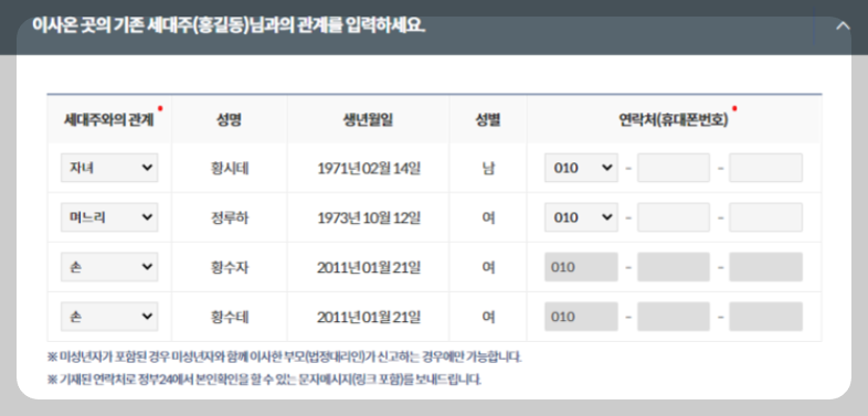- 전입자 전원에 대한 연락처 정보를 입력하도록 변경되었습니다.