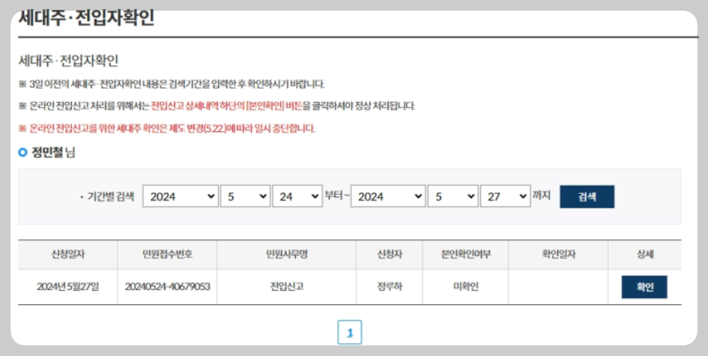 으며, 모든 전입자의 확인이 완료되어야만 정상적으로 전입신고 신청이 완료됩니다.