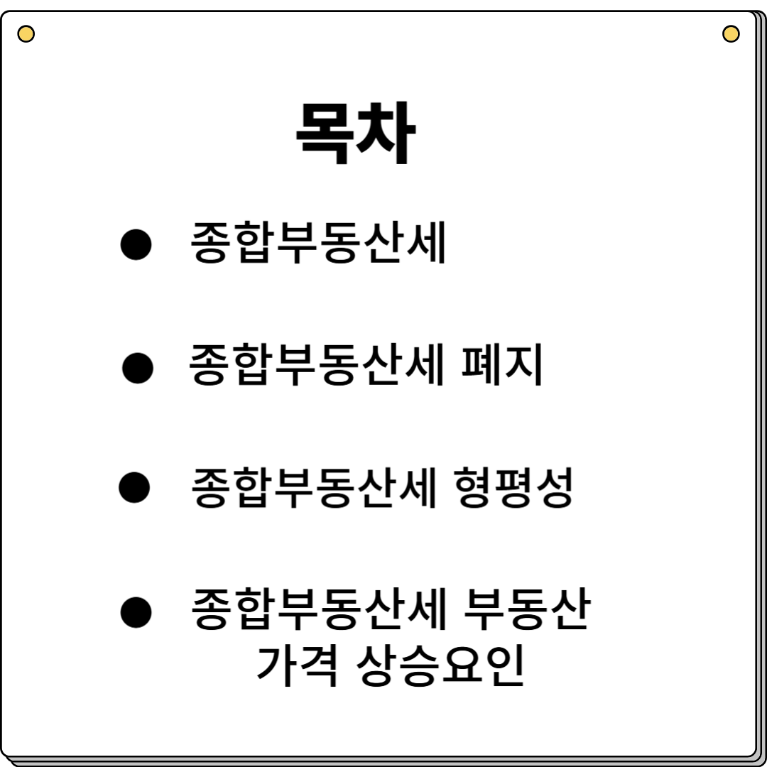 - 종합부동산세 폐지로 문제점은 1 주택에 가액으로 인한 형평성이 대두됩니다.