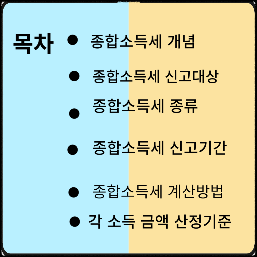 - 종합소득세는 개인이 근로소득, 금융소득, 사업소득, 연금소득, 이자소득, 배당소득, 기타 소득에서 발생되어 얻은 직