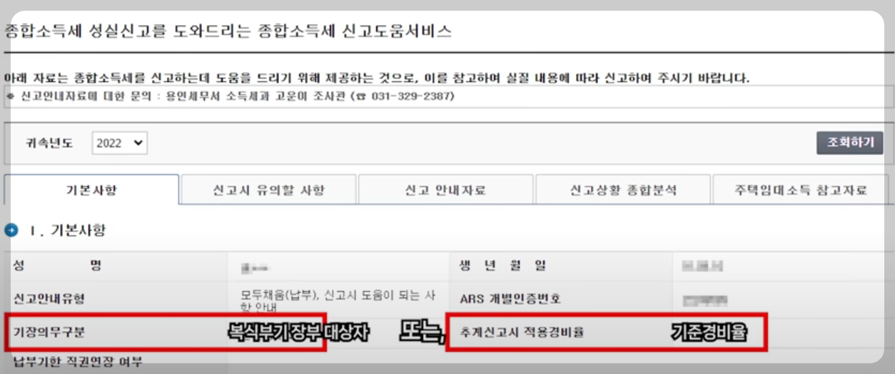 ⑪ 아래 화면과 같이 [복식부기장부대상자] 이거나 [기준 경비율]을 적용받는다면, 외부(세무사 등)에 이뢰하여 신고를 하도록하는것이 좋은 방법입니다.