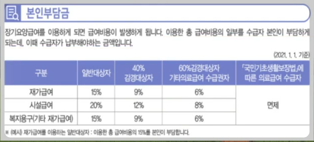 - 재가급여를 이용하는 일반대상자는 총급여액에 15%를 본인이 부담해야 합니다.