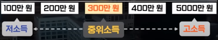 - 중위소득 : 전체가구를 소득순으로 순위를 매긴 다음, 중간순서 가구의 소득 수준