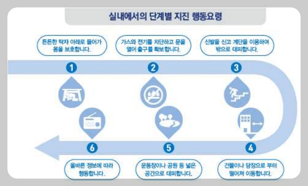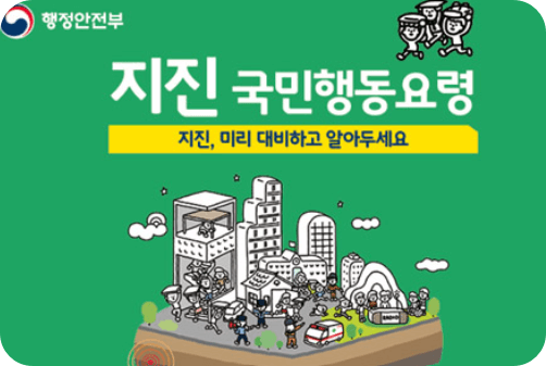 우라나라는 일본, 중국등 주변 국가들에 비해 지진에 대하여 안전한 나라로 인식되어 있었으나 최근 우리나라에서도 지진으로 많은 피해가 발생하였습니다. 우리나라도 더 이상 지진 안전지대가 아니라는 경각심을 가져야 한다. 피해를 줄일 수 있는 방법은 지진행동요령을 숙지하여 사전 준비해야 한다.