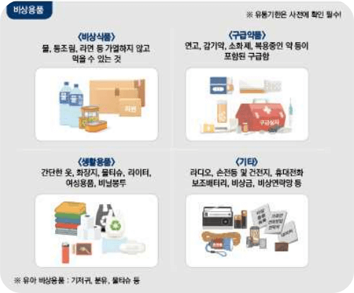 ◦ 지진에 대비하여 비상용품을 준비해 두고 보관장소와 사용밥법을 알아둡시다.