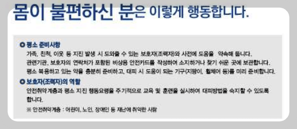 ◦ 주변사람들에게 청각장애가 있다는 것을 알리고 안전한 장소로 유도 및 필