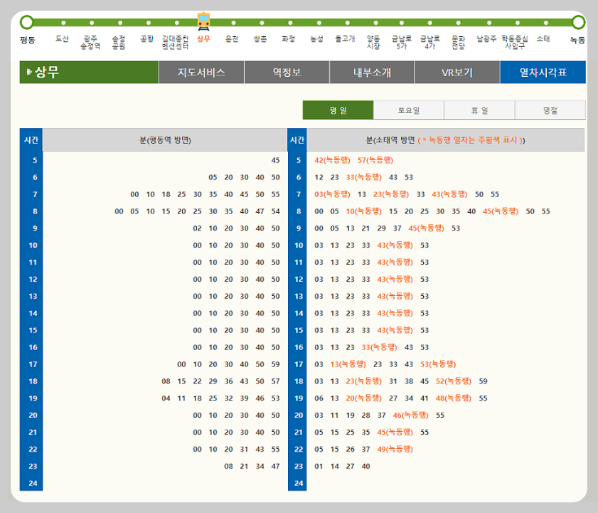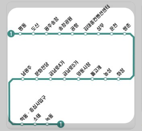 ⦁ 평동 → 송정공원 → 공항 → 김대중컨벤션센터 → 금남로 5가 → 학동 → 녹동.