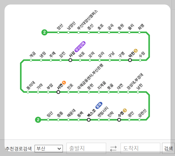 ⦁ 2호선 : 양산 →사상 →동의대 →서면 →경성대, 부경대 →수영 →해운대 →장산.