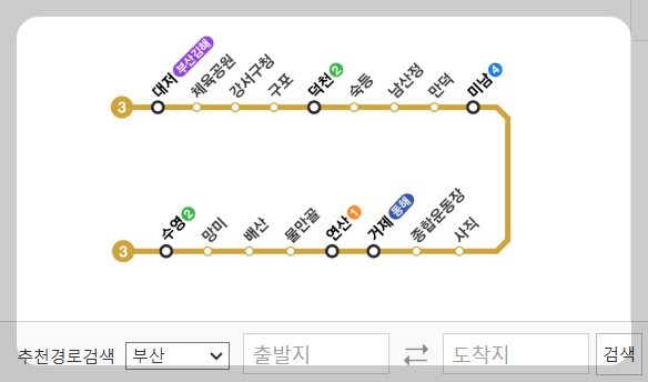 ⦁ 3호선 : 대저 →강서구청 → 미남 →종합운동장 →연산 →수영.