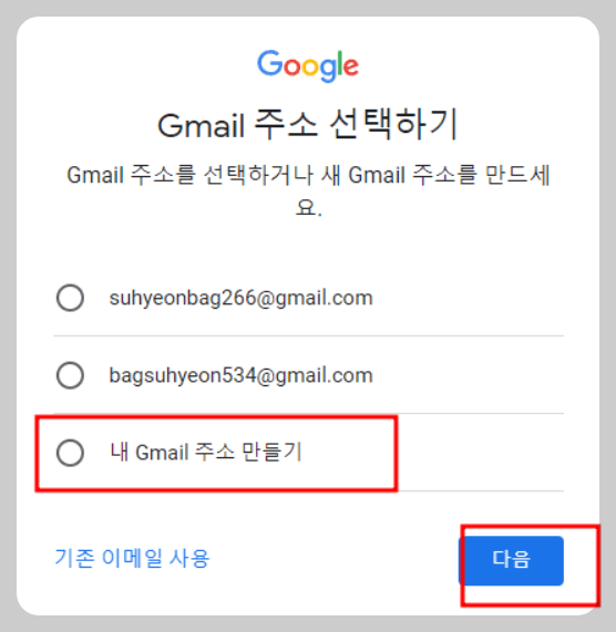 ⑧ 내 Gmail주소 만들기를 누르고, 다음을 누릅니다.