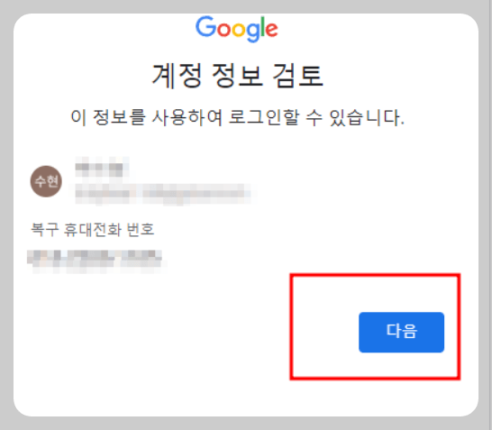⑩Google에서 SMS(요금이 부과과 될 수 있음)를 통해 전화번호를 확인. 본인 전화번호를 입력해 주고 다음버튼 누릅니다.