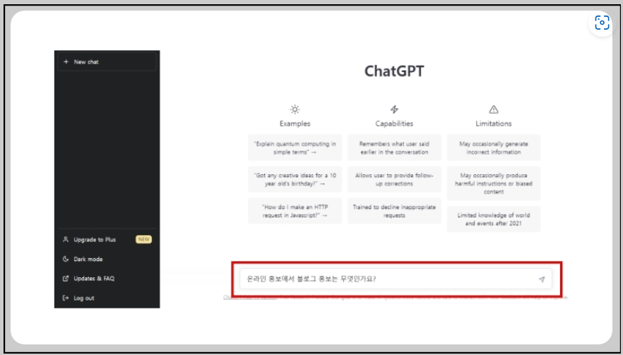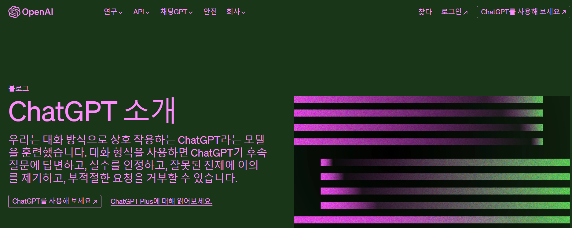 위 화면 검색창에 https://openai.com/blog/chatgpt를 를 입력하면 아래 화면이 나옵니다.