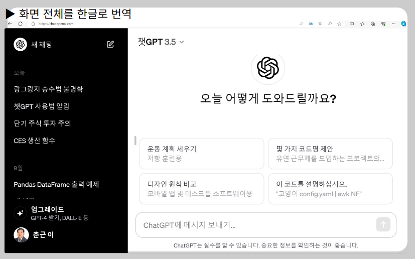 ③ 좌측상단에 ChatGPT를 클릭하면 새로운 채팅창이 열립니다. 이곳에서는 서로 다른 대화를 하는 것이 좋습니다