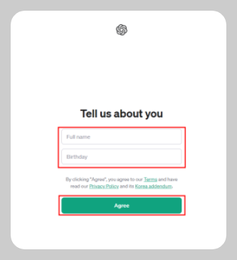 ⑧ 이름과 생년월일을 일, 월, 년도를 입력합니다. Agree클릭합니다.