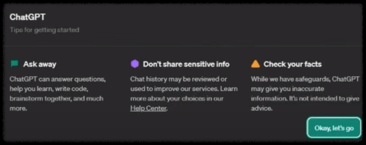 ① 가입완료 후 ChatGPT 시작으로 Okay let's go를 클릭하면, 화면이 변환되면서 챗GPT화면이 아래와 같이