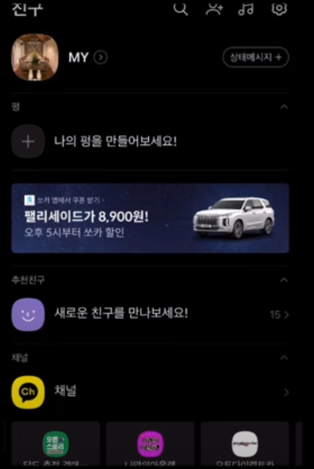 클릭하여 채널친구를 추가합니다. 그럼 친구목록에 아 숙업이 니타 납니다.