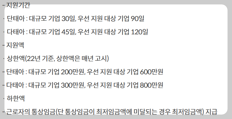 대한민국은 인구 감소로 출산을 장려하기 위해 여러 가지 지원 방법을 내놓고 있다. 전업주부와 달리 근로자는 출산 전. 후로 남모를 고통과 정신적 스트레스를 받고 있다. 근로기준법에 따라 임신 중인 근로자는 출산전후(유산. 사산) 휴가급여가 지원되는 만큼 많은 도움이 되기를 바란다