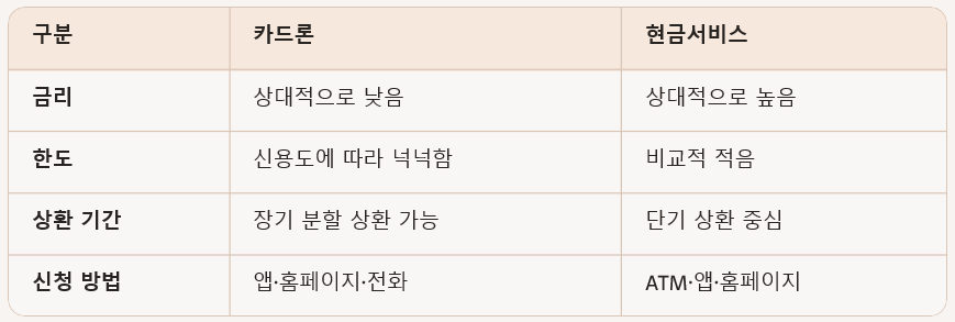 ※ 현금서비스는 단기 자금 조달용, 카드론은 장기 대출용이라고 이해하면 됩니다.