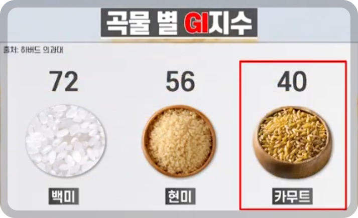 ⯄ 당뇨예방으로 카무트는 혈당지수가 낮아 음식을 섭취 후 혈당이 천천히 상승합니다.