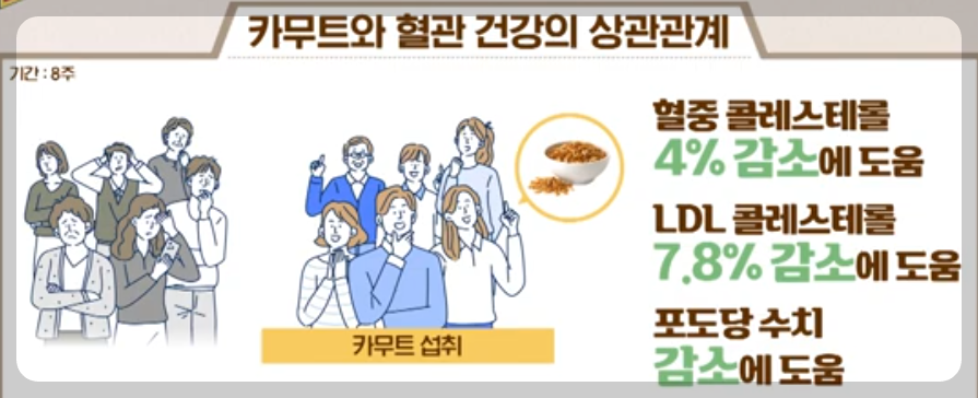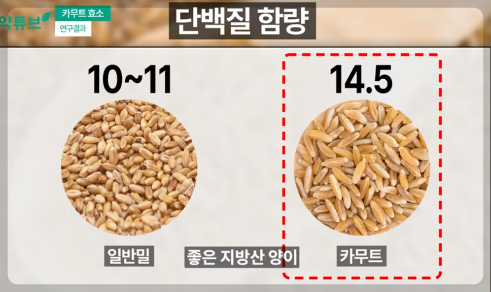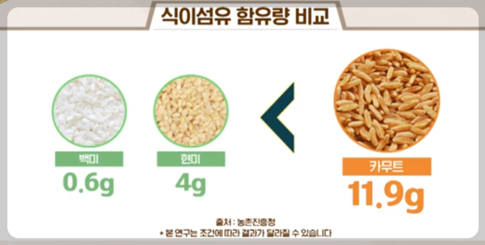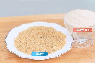 - 카무트에는 식이섬유가 풍부하게 함유되어 있어 장 내벽 강화를 하고 장 염증 개선에 도움을