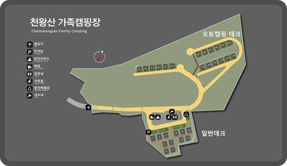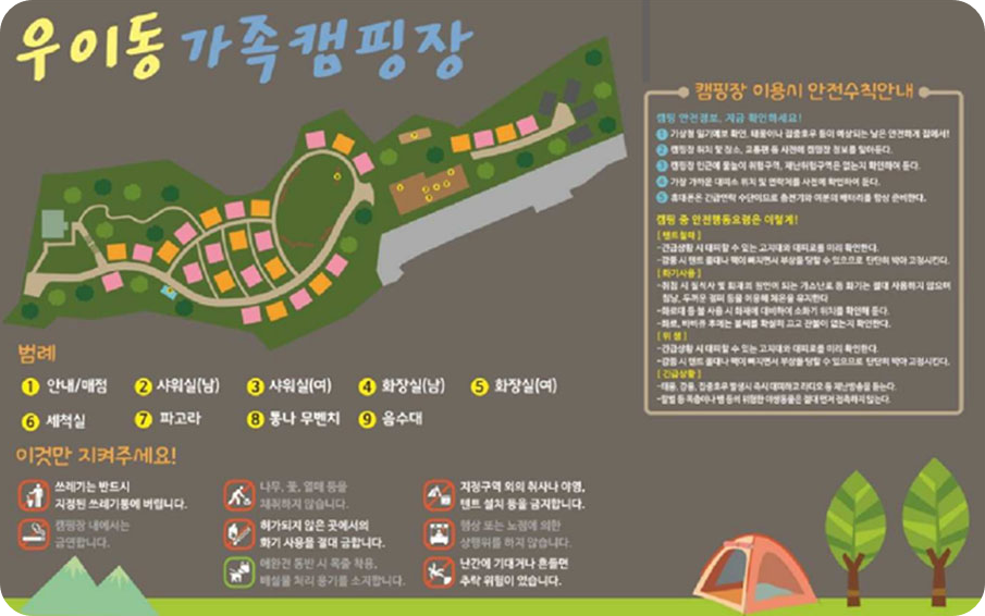 ⯄ 식수대, 식기세척실, 화장실, 샤워실 등편의시설과 어린이 모래놀이터, 산책로 등이 잘 조성되어 있습니