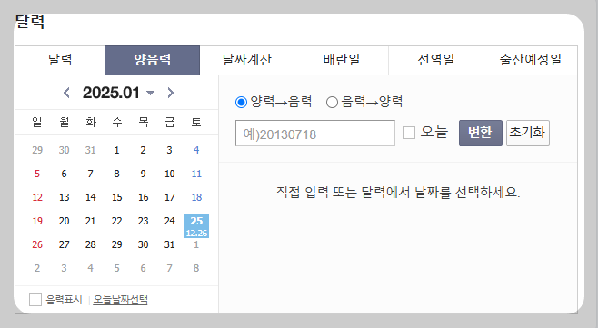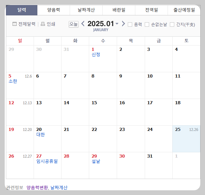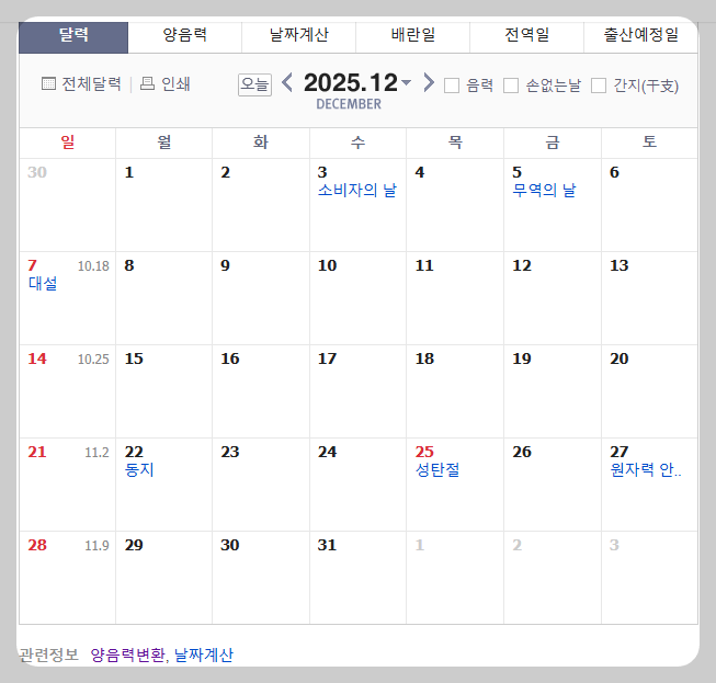 ✱ 12 월 양음력 변환과 일생생활에 필요한 날짜계산 변환.