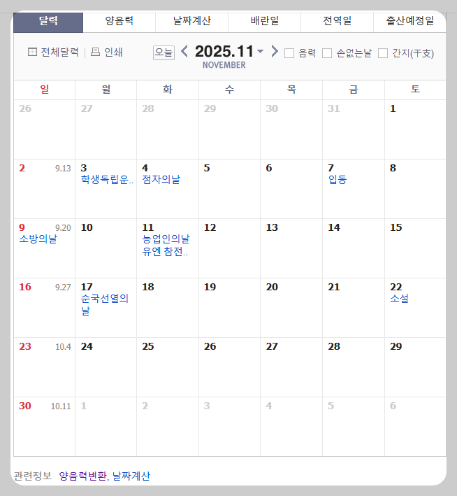 ✱ 11월 양음력 변환과 일생생활에 필요한 날짜계산 변환.