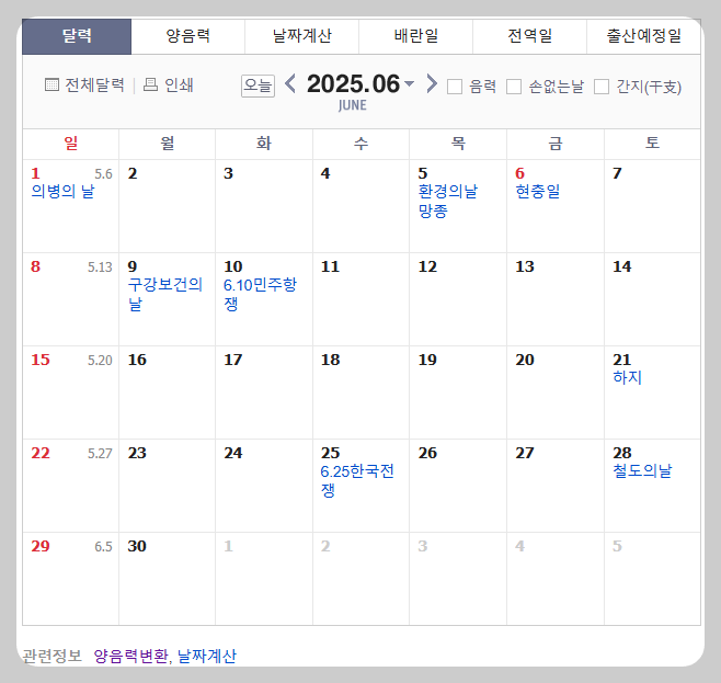 ✱ 6월 양음력 변환과 일생생활에 필요한 날짜계산 변환.