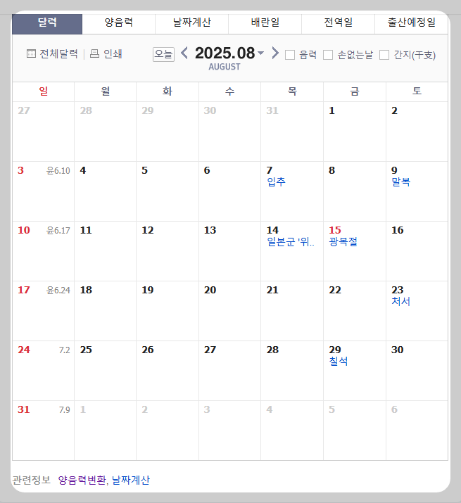 ✱ 8월 양음력 변환과 일생생활에 필요한 날짜계산 변환.