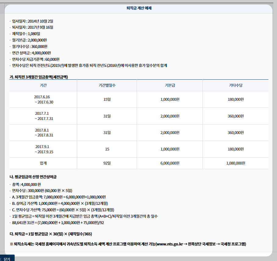 ※ 평균임금산정할 시에 연차수당, 상여금, 성과급 등 월급 외로 받은 것 포함한 후 3/12으로 계산하여 합산한다.