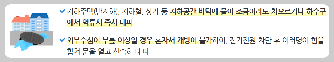 | 응급약 손전 등을 준비한다. | 상습침수지역 주민은 대피를 준비한다 | 침수된집은 가스가 차있을 수 있으므로 환기를 먼저합니다. |