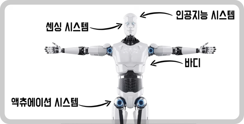⯄ 휴머노이드 로봇은 크게 인공지능시스템,, 센싱 시스템, 바디, 액츄 에이션 시스템으로 구성되어 있습니
