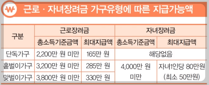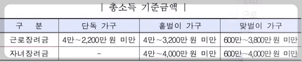 ※ 자녀장려금은 18세 미만(중증장애인은 연령제한 없음)의 부양자녀가 있어야 함.