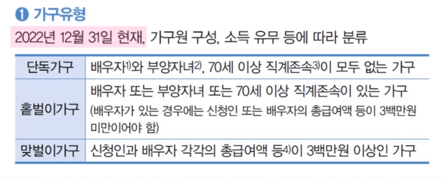 1. 소득과 재산이 기준보다 적은 가구가대상. 소득은 연소득이 기준이다. 아래표 참조하기 바랍니다.