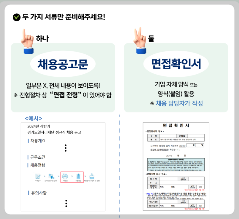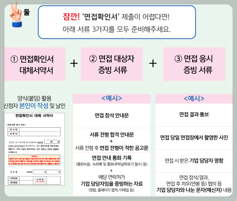 - 면접확인서 : 기업 자체양식 또는 양식(붙임) 활용. 채용담당자가 작성.