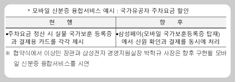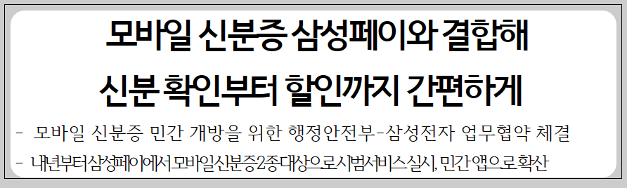 2024년부터는 정부와 삼성페이가 결합 모바일 운전면허증과 국가보훈등록증 2종을 발급받아 시범실시할 예정입니다.