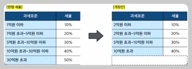 - 과세표준 30억 원 초과는 개정안에서 삭제를 하여 최고세율을 10% 낮추었습니다.