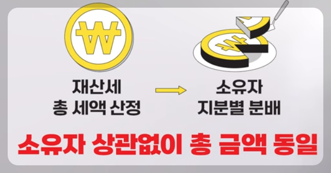 - 재산세는 총금액을 먼저 계산하고 소유자의 지분비율로 금액을 나누기 때문에 동일합니다.