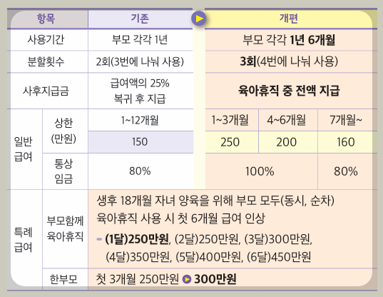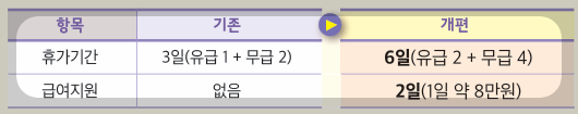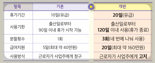 ⦁ 배우자 출산휴가 기간 10일 → 20일 (휴가 기간 20일로 확대)