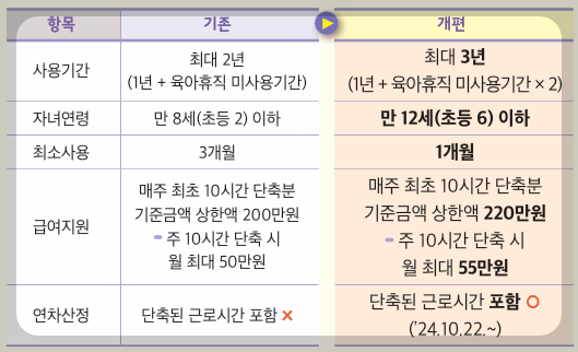 사용기간이 최대 3년으로, 대상 자녀연령도 만 12세(초등 6) 이하로 확대됩니다