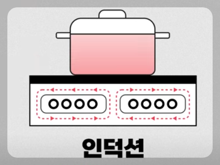 - 인덕션은 자기장을 형성하는 코일을 이용해 전자기를 유도하고 저항으로 상판을 가열하는