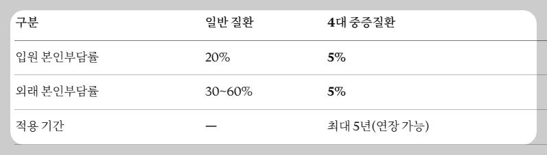 습니다. 바로 암, 심장질환, 뇌혈관질환, 희귀 난치성질환입니다. 이 네 가지 질환은 치료 기간이 길고, 고가