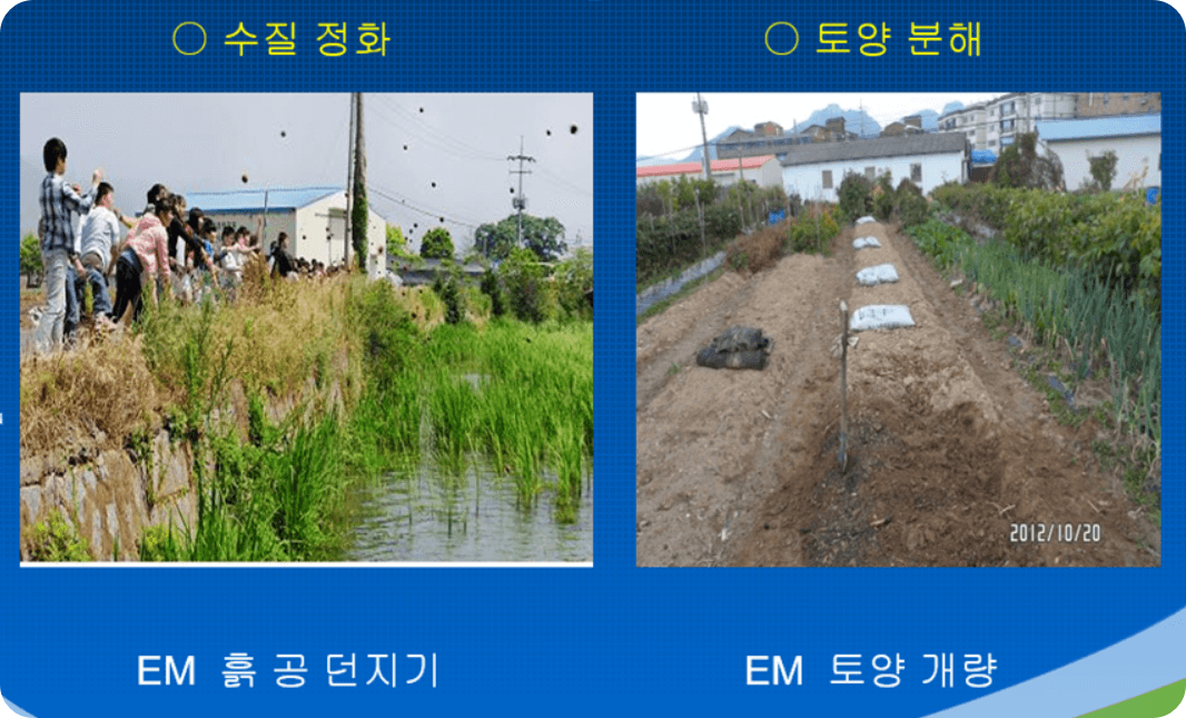 비만 오면 땅에서 오염물질이 하천으로 흘러내려온다. 거리에 굴러다니는 쓰레기도 한 목을 한다. 미세먼지와 논밭의 화학비료 그리고 농약의 잔재물들이 흘러서 하천으로 들어와 오염을 시킨다. EM 미생물을 이용하여 하천에 오염된 수질과 토양이 오염된 것을 미생물을 이용하여 유기물을 분해하는 정화작업을 해야 한다.